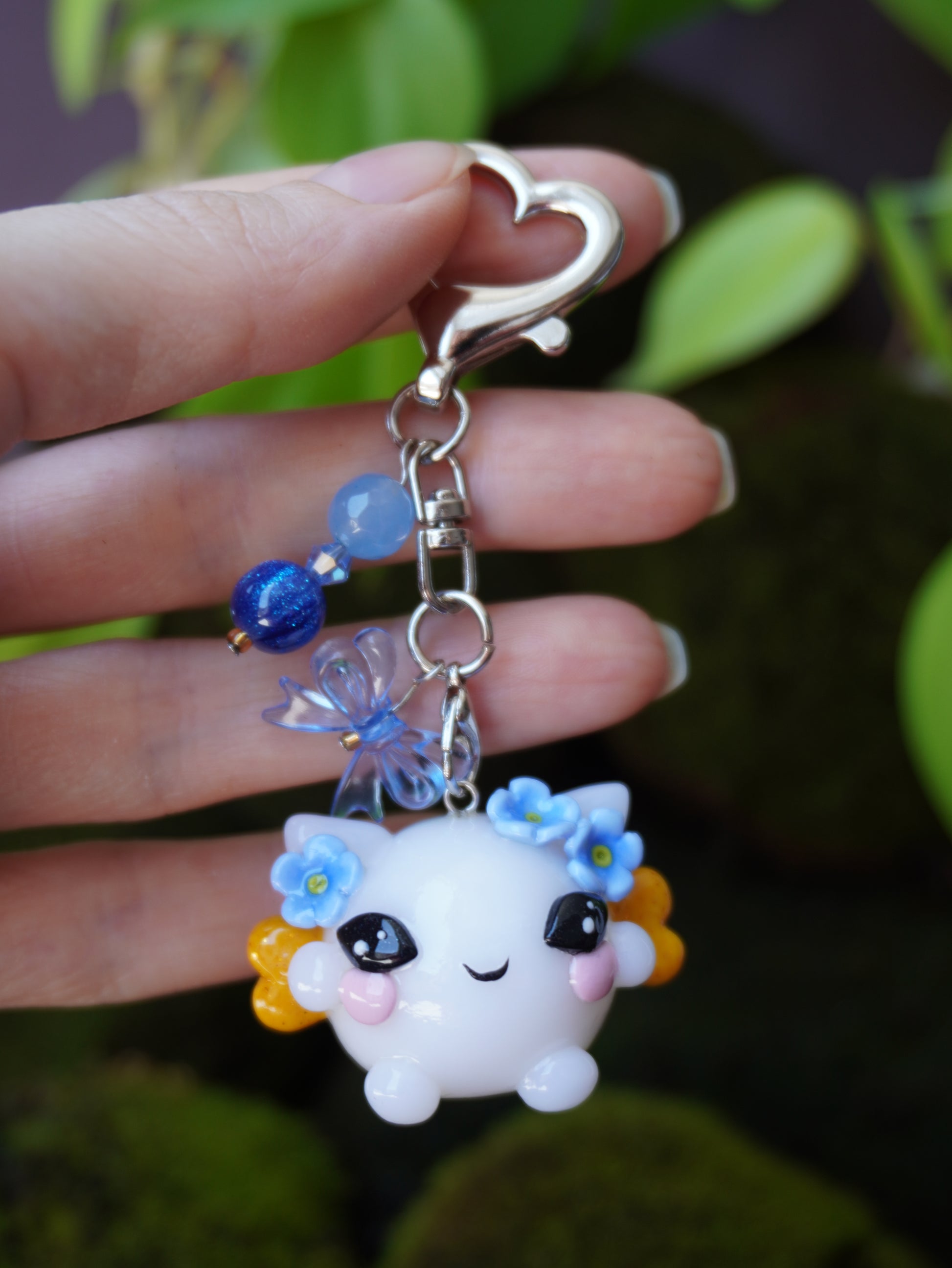 This handmade keychain is crafted from polymer clay, and carefully chosen beads, then sealed with three layers of thick glossy varnish for durability and shine.